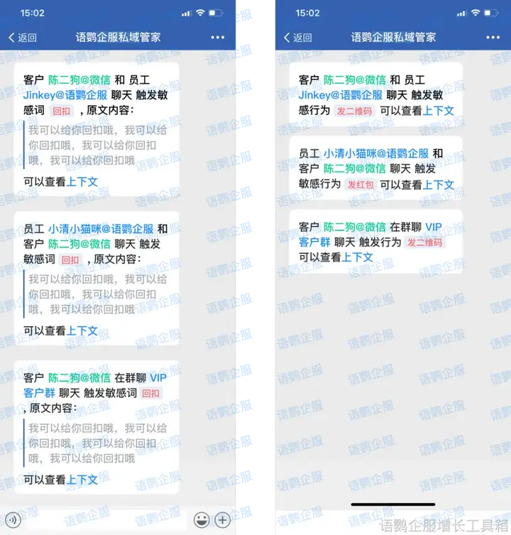 敏感词监控:可以设置敏感词库,系统会自动监控聊天记录中是否包含敏感词,并及时发出预警,帮助企业规避风险。