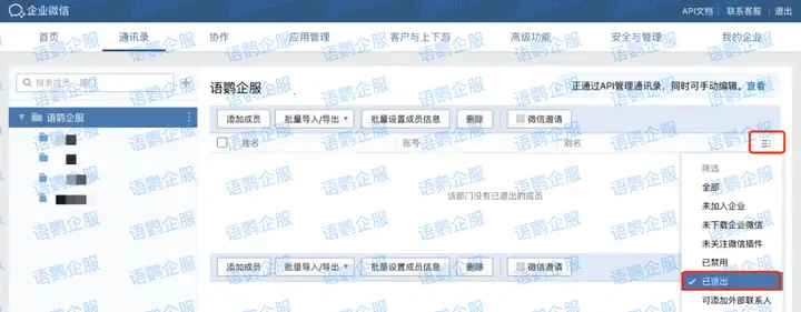 企业管理员可以便捷地查询已退出企业微信的员工。具体方法如下:登录企业微信管理后台后,在左侧菜单栏中点击“通讯录”,然后在通讯录页面右上角点击如图按钮,在下拉菜单中选择“已退出。在“已退出”页面,你可以查看所有已退出企业微信的员工列表,包括他们的姓名、部门、职位等信息,方便企业进行人员管理和数据统计。