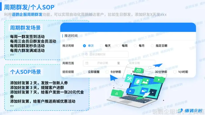 对于需要定期触达客户的场景,例如活动预告、节日问候、新品推荐等,语鹦企服增长工具箱提供的「定时群发SOP」功能可以帮助企业实现自动化客户运营。通过预先设置好触达时间和内容,系统会自动在指定时间提醒员工向目标客户发送消息,既节省了人力成本,又能确保客户及时收到相关信息,提升客户满意度和转化率。 这也是一种巧妙的“提醒”方式,提醒客户你的存在和价值,并促成最终的转化。