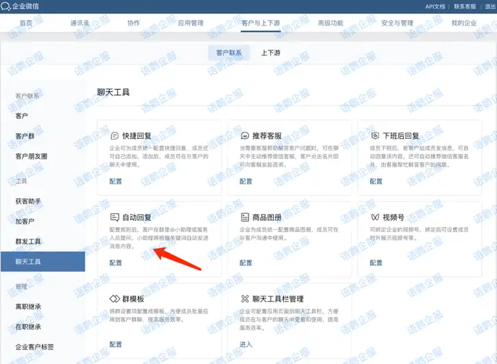 只需要企业管理员登录企业微信管理后台,在“客户与上下游”页面,找到“客户联系”功能,并点击“聊天工具”板块,即可找到“自动回复”功能,在配置页面中,你可以进行关键字及自动回复内容规则的设定。
