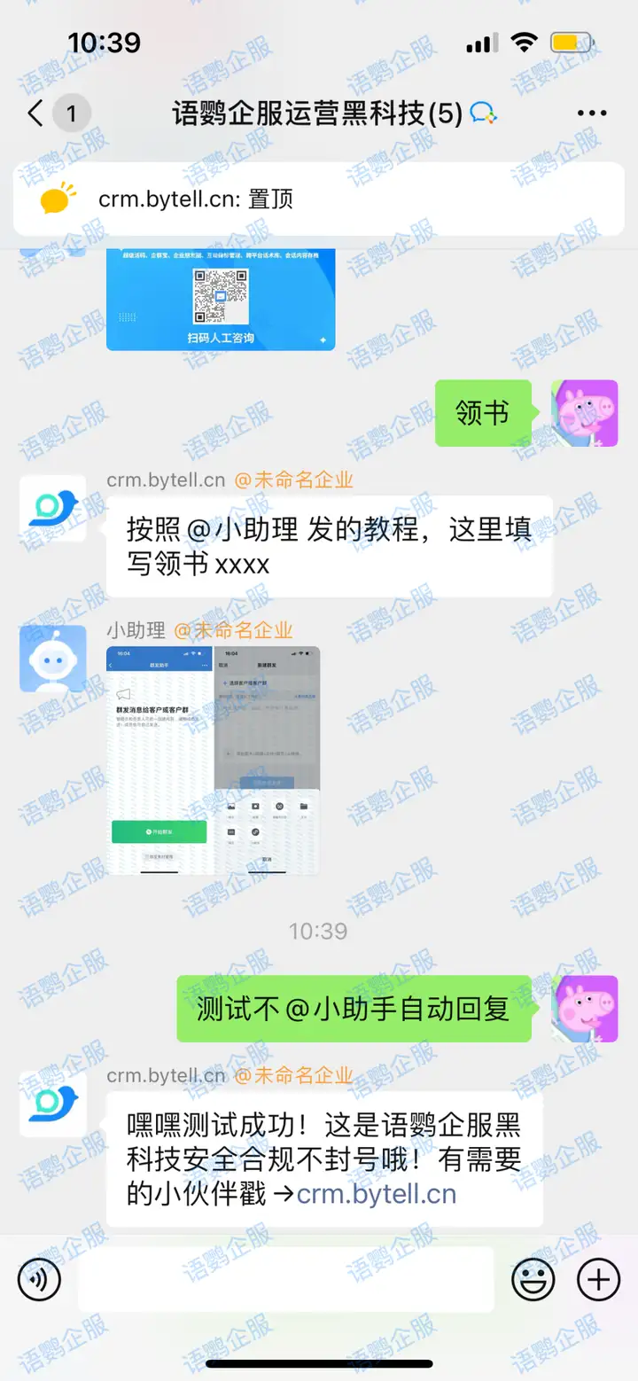 语鹦企服通过整合多项技术和功能,总结了一套独特的解决方案,帮助企业轻松实现不@小助手自动回复。如下图所示,用户无需@小助手 ,只需要触发关键词,即可获得自动回复。重要的是:这个方案无需用到任何违规外挂工具,完全安全合规不封号!