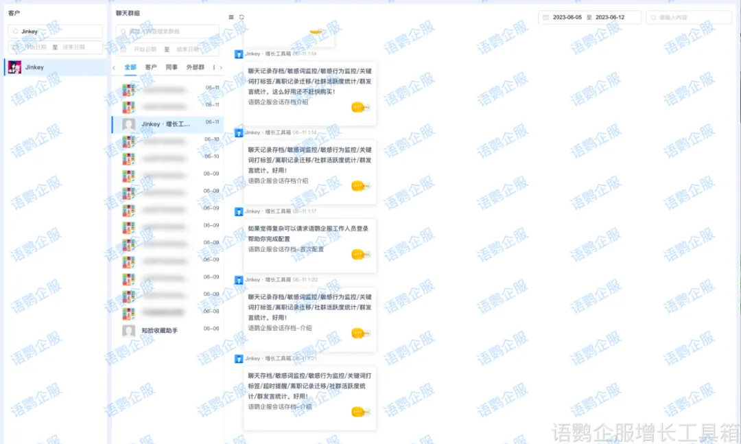 值得一提的是,语鹦企服增长工具箱为企业提供了更加智能的数据管理解决方案。通过其会话存档功能,企业可以在删除本地聊天记录的同时,确保重要的业务沟通内容得到妥善保存。这样既解决了存储空间问题,又避免了重要信息的丢失风险。