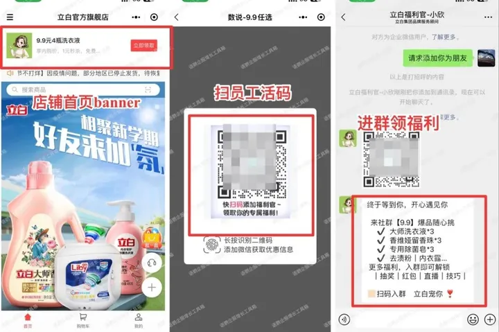 另外,公司自己拥有的私域工具,如SCRM系统、会员管理系统等,也是私域流量管理的重要工具,比如立白官方旗舰店小程序,在他的小程序banner处会有福利“9.9元4瓶洗衣液”,点击领取就会出现企业微信的员工活码,扫码即可进群领福利。