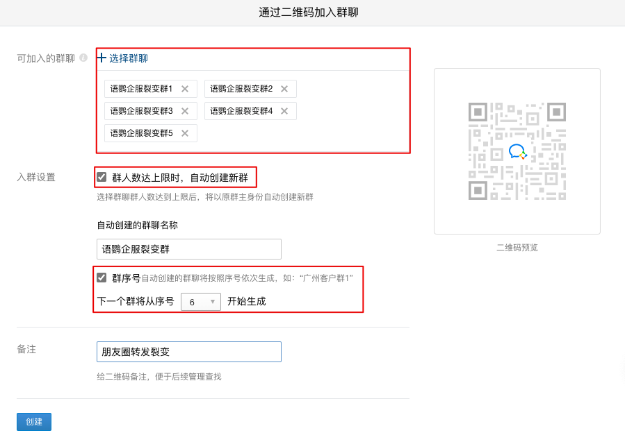 建议:由于自动建群功能创建的新群不会同步自动配置入群欢迎语、群机器人自动回复等,建议一次性把创建好的5个群聊添加到后台的活码中来。