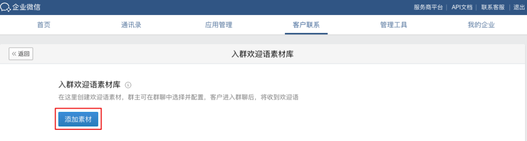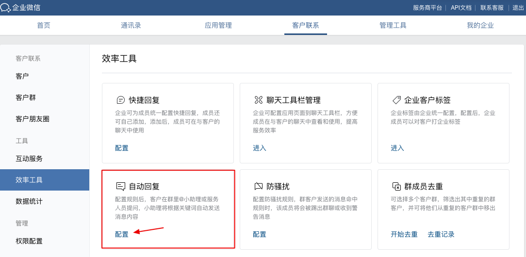 登陆企业微信管理后台,依次点击【客户联系-互动服务】–【入群欢迎语】的【配置】
