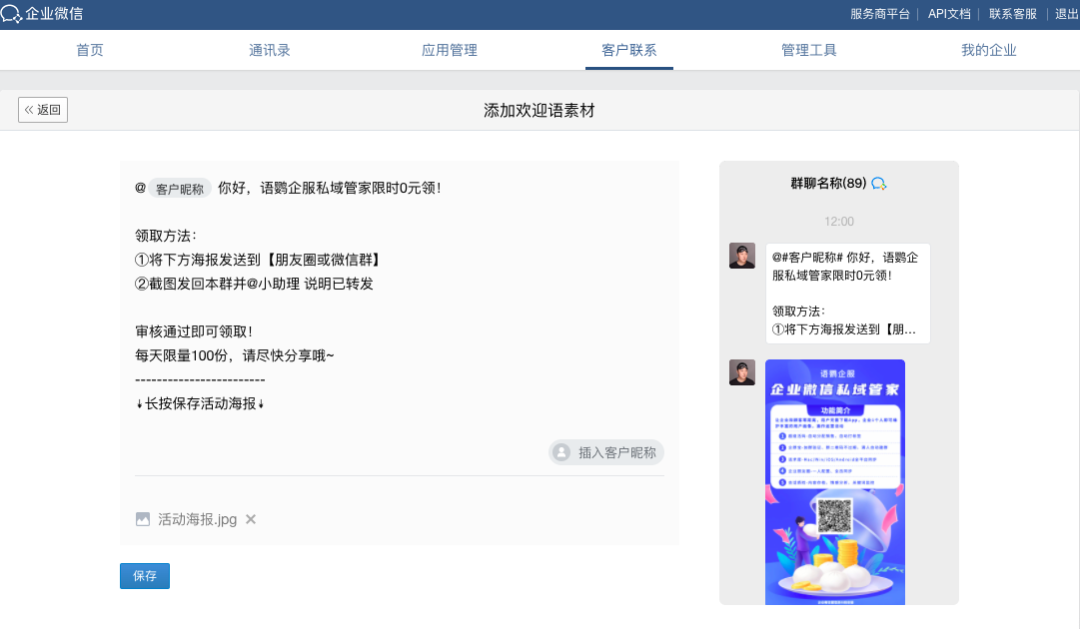 按照提示填写入群欢迎语和转发海报,在右侧可以看到预览效果图。