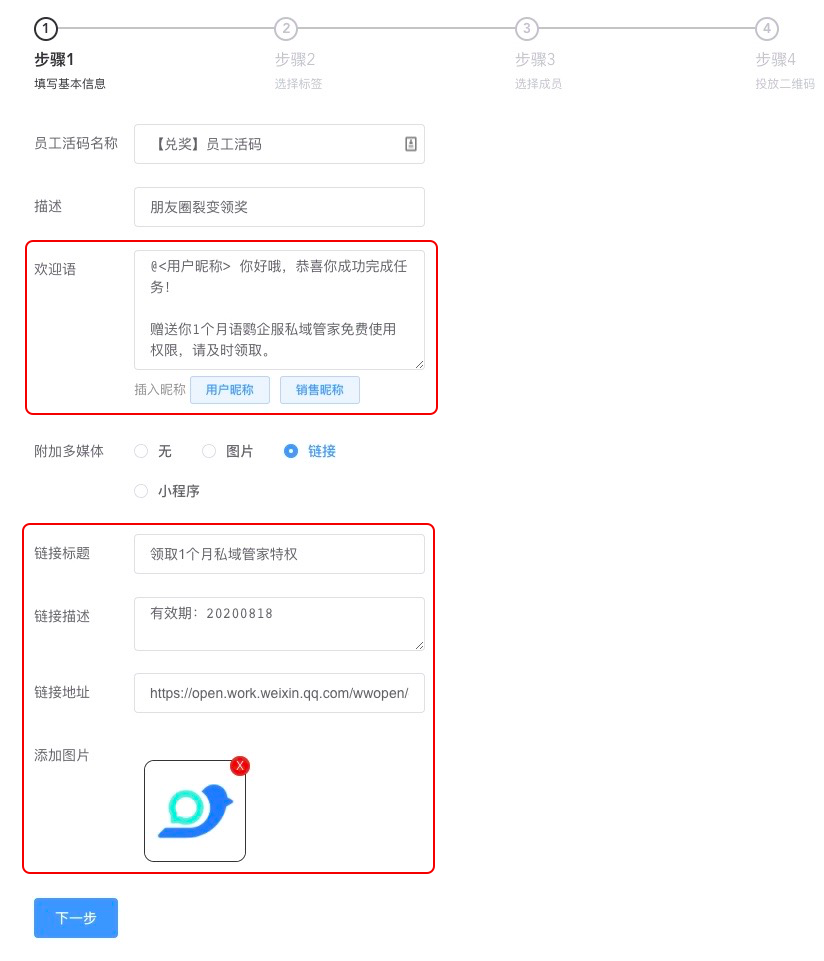 ①这里将奖品信息设置为员工活码欢迎语,这样新用户完成任务后添加该员工,即可实现自动发奖。
