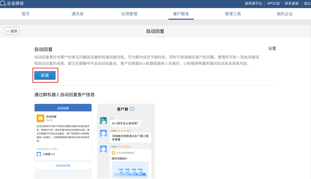登录企业微信管理后台后,依次点击【客户联系-效率工具-自动回复-配置】,【新建】自动回复规则。