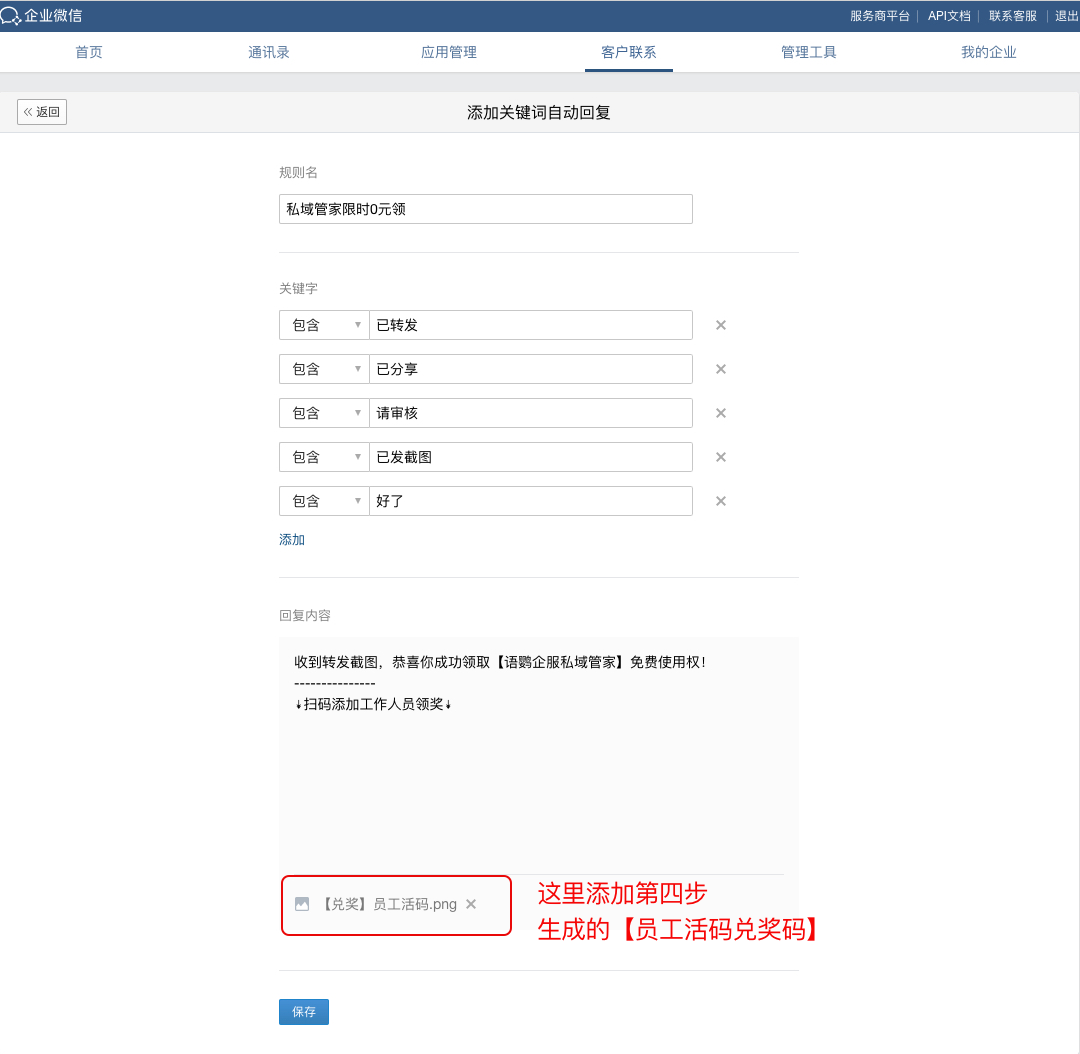 添加关键词及自动回复内容。一条规则可设置多个关键词,自动回复的内容支持图文、网页、小程序等内容。这里自动回复内容添加的图片即为第四步生成【员工活码兑奖码】。