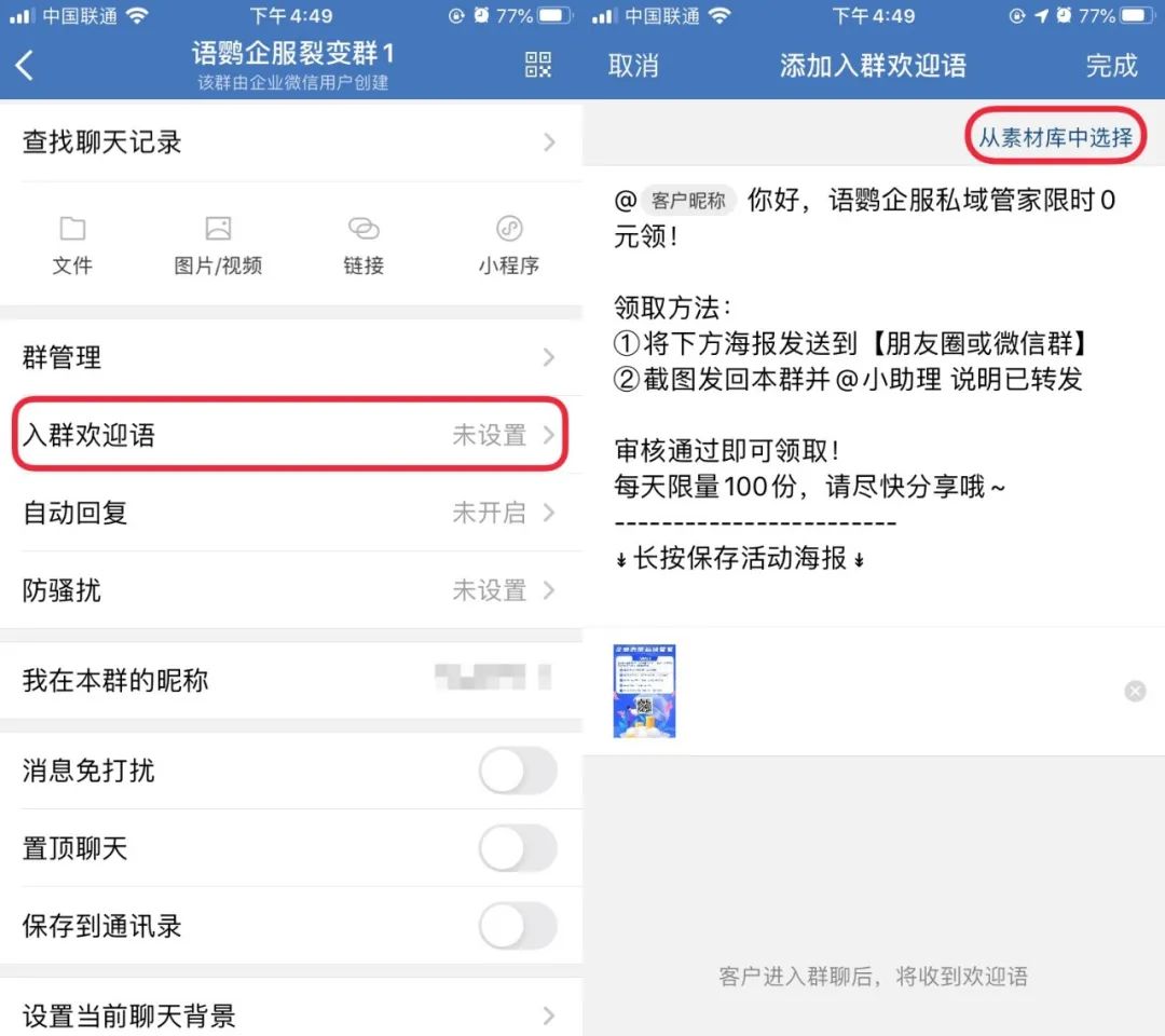 群主进入第一步建立的群聊里,点击右上角的小人头,开启【入群欢迎语】,【从素材库中选择】快速添加;