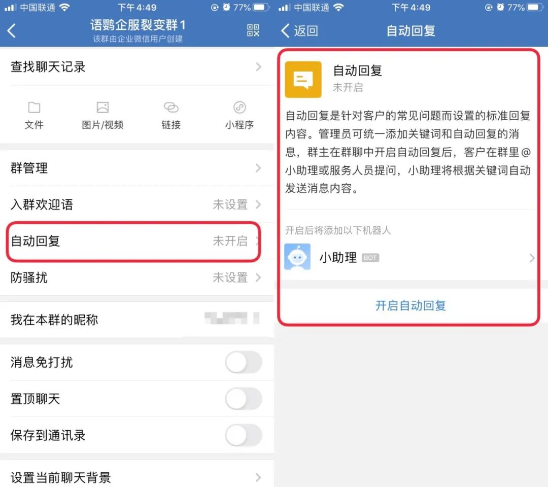 开启自动回复机器人。当群成员转发海报后在群内@小助理 并触发关键词时,就能实现自动审核啦。
