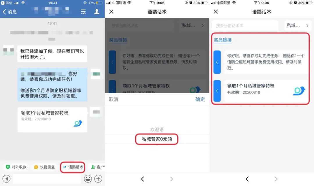 用户完成转发任务后,添加工作人员为好友,即可自动领奖,系统也会自动给客户打上标签。对于老用户领奖,可以使用语鹦企服话术库,提前配置好话术,实现快捷发放奖品。