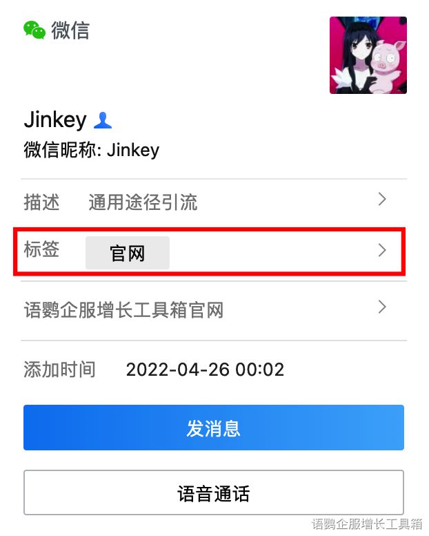 利用语鹦企服【标签管理】工具,客户加进来后,在后期的日常沟通中,可以根据客户的基础信息、接触点偏好、兴趣爱好、产品需求偏好、社交传播点等手动设置丰富标签,细化标签特征。