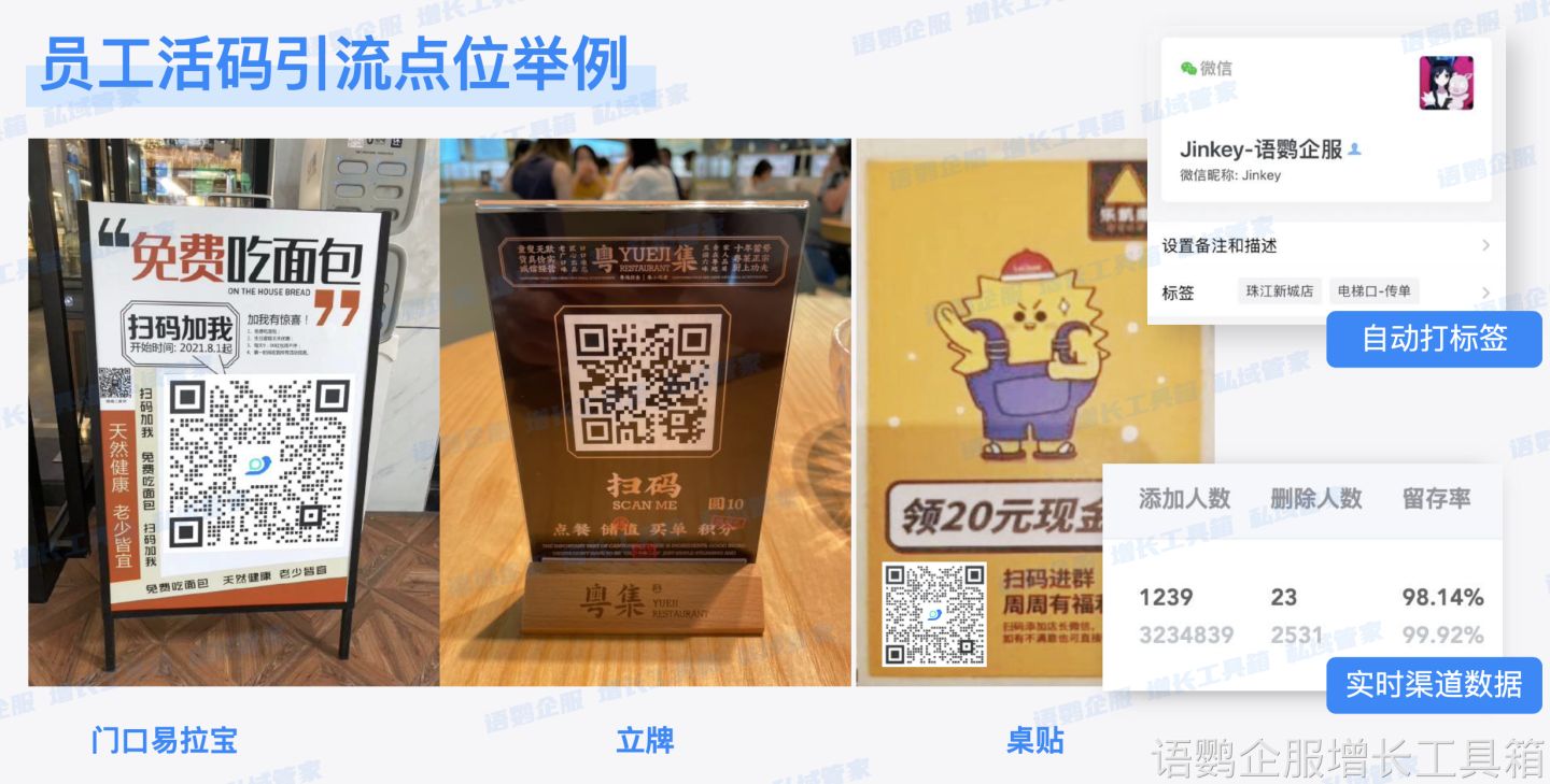 企业可以使用语鹦企服【员工活码】,在门店引流、自动拉群、客户接待、自媒体投放渠道等场景中,实现精准用户引流。客户扫描员工活码后,可自动通过好友,自动打上渠道标签,并发送个性欢迎语,帮助企业实现精细化客户运营。