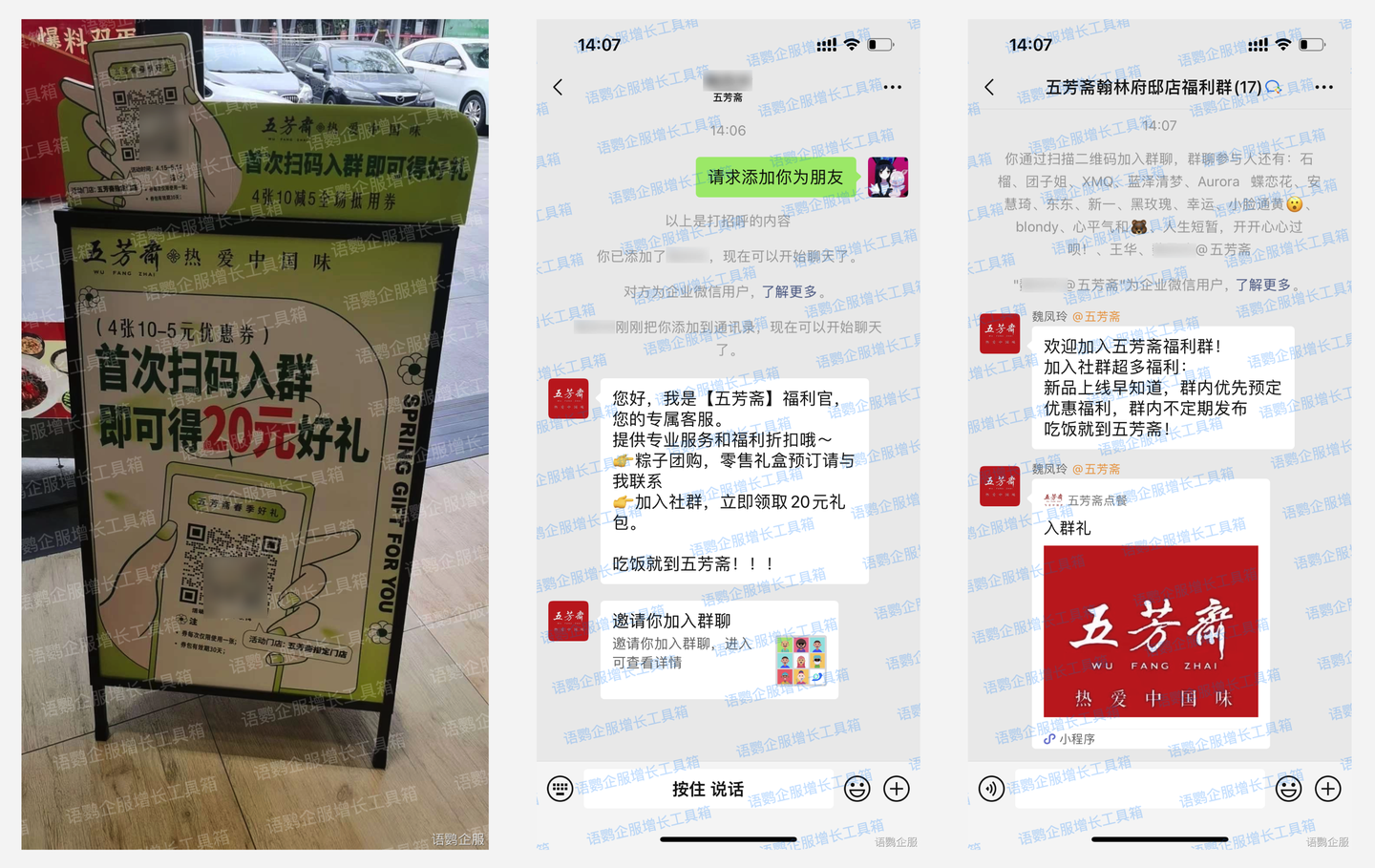 通过门店易拉宝,设置20元进群礼,先引导顾客添加企业微信,再通过语鹦企服自动邀请进群功能邀请用户进群,进群会自动发送入群礼。如此一来不仅客户能够在私域得到福利待遇,同时也扩大品牌的曝光和影响力,更重要的是提供了品牌和客户之前更多的互动及转化机会。
