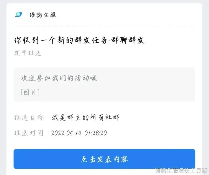 社群运营还包括制定详细的内容日历和计划,确保社群中定期发布内容,并保持一致性,语鹦企服的「定时群发sop」功能,可以创建定时任务,到时间会自动发送给员工,员工收到通知点击发布即可完成。