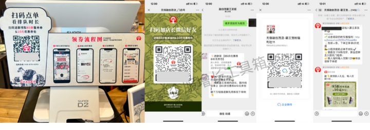 比如霸王茶姬的门店处有「扫码点单看排队时长」和「扫码进群领取85折&10元优惠券包」的引流牌,并搭配「员工活码」,客户扫码过后就会加入群聊成为其线上潜在客户。