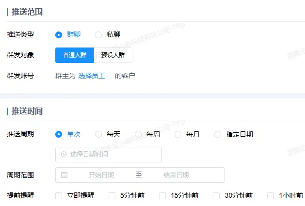 企业可以借助语鹦企服的「周期回访」功能,该功能可以帮助企业提前设置好客户的回访时间和内容,时间一到,系统就会自动提醒员工将设置好的内容一键发送,推送周期可以按天、周、月或指定日期来进行,防止当客户太多时员工忘记对客户进行回访,导致客户流失。
