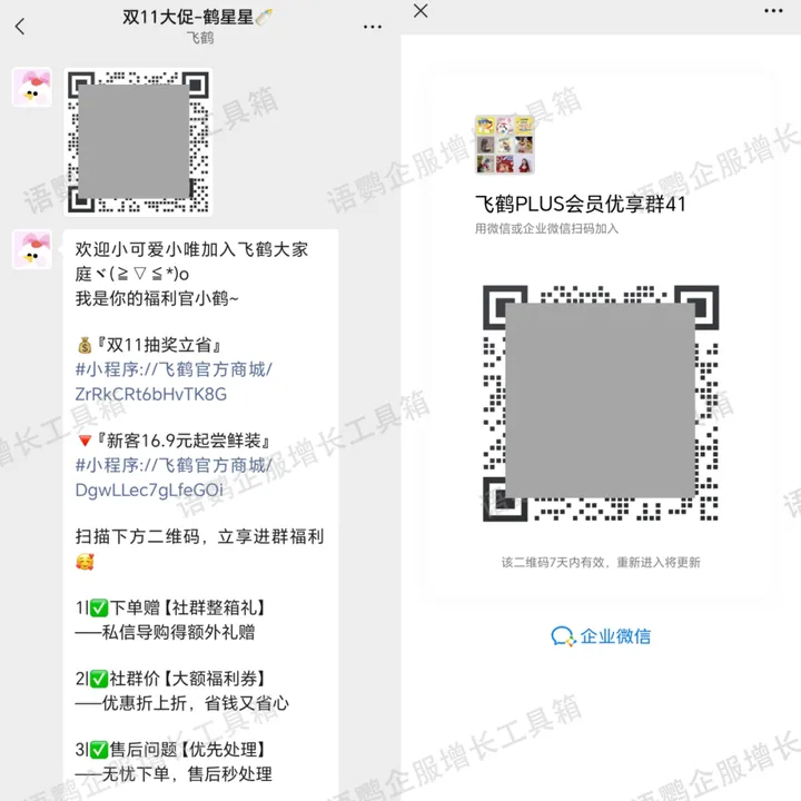 用户添加导购“鹤星星”后,自动发送社群福利说明和进群二维码,引导用户进一步扫码进入品牌社群,完成“小程序→企业微信→社群”的引流路径。