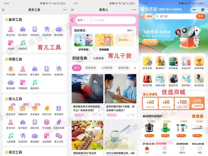 飞鹤奶粉利用小程序搭建了私域育儿平台——星妈会,内置各类育儿小工具(疫苗时间表、生长曲线、儿歌故事等)、科学育儿干货(宝宝食谱、奶粉百科、孕期各阶段)、星妈优选商城、会员免费问诊等功能板块,满足平台用户在育儿期间喂养、购置相关产品等各项需求。