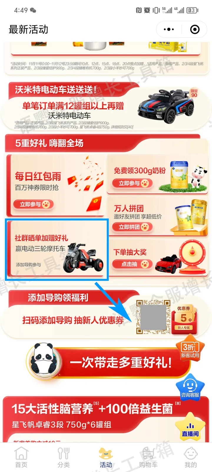 在小程序商城中,飞鹤奶粉埋入了很多引流点,在“首页、0元试用、最新活动、拼团活动”等页面均嵌入了企业微信二维码,利用“新客0元购”、“加导购领福利”、“0元抽奖”等活动作为诱饵,引导用户扫码添加,将用户从小程序引流至企微号。