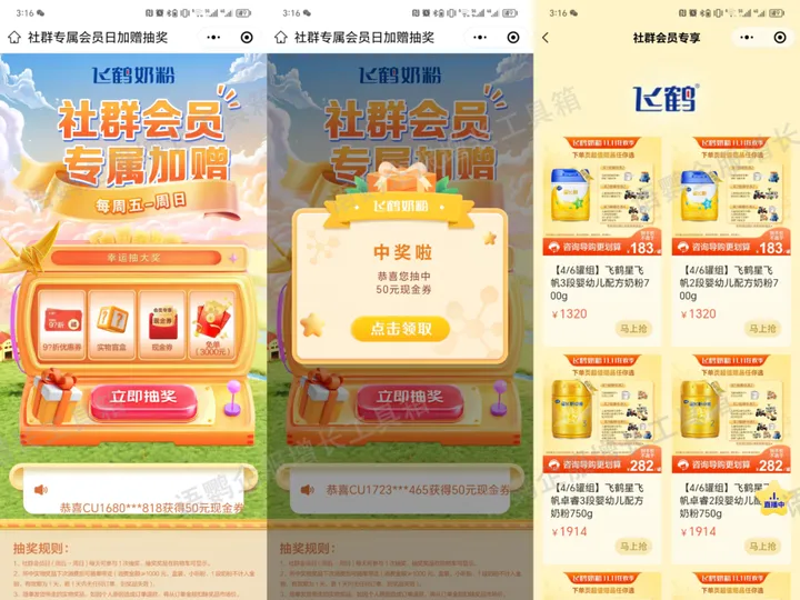 在社群分层方面,除了基础的会员优享群,飞鹤奶粉还组建了“飞鹤高级会员群”,入群门槛是在小程序下单≥1000元。高级会员群的福利优惠力度更大,忠实用户的活跃度也更高,能够帮助品牌巩固高粘度粉丝,建立更深厚的心智联系。