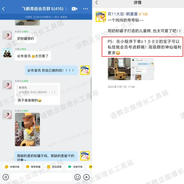 以上就是《飞鹤奶粉会员数超4000万!母婴行业做爆社群的打法内参分享》的相关内容了,简单来说,母婴行业做私域社群更需要站在目标用户的角度,在内容输出、商品搭配、活动玩法等方面尽可能满足宝妈的育儿需求,才能收获大量的忠实用户。更多企业微信玩法,关注语鹦企服私域管家。