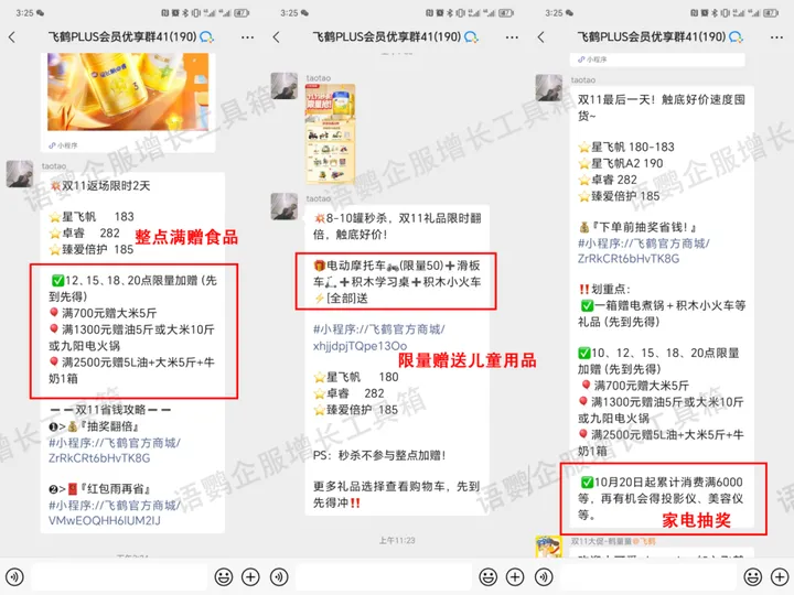 双十一活动期间,为了提醒会员在相应时间开抢,飞鹤的管理员会在一天中选择几个整点时间发送优惠信息,提醒有购买需求的宝妈及时下单。在促销活动期间,品牌更需要做好内容SOP规划,可借助语鹦企服【定时群发SOP】功能,做好未来一天、甚至一周的促销内容计划并规定推送时间,到点提醒运营人员一键群发/发朋友圈/发社群,全方位及时触达用户。