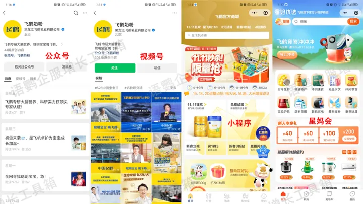 飞鹤奶粉始建于1962年,是中国最早的奶粉企业之一。随着宝妈人群年轻化,线上消费占比增大,飞鹤奶粉先后搭建了官方公众号、视频号、小程序商城、企业微信号、社群、星妈会育儿平台等一系列私域矩阵,在线上进一步开拓市场。