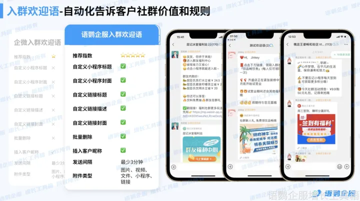 当消费者扫码后,系统会邀请消费者点击进群,自动分配到附近门店福利群,进群后收到欢迎语+新人专属链接,让消费者立马获得福利,知道进群规则,并可立马点击跳转到小程序下单,给门店带来营收。就像语鹦企服的「入群欢迎语」功能,当客户一进入社群,系统就可自动推送小程序、链接、文件等多种类型的内容,满足企业营销需求,并可加入客户昵称,让客户有亲切感,提升服务质量。