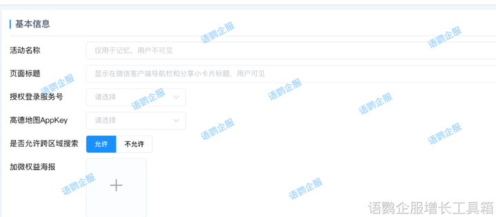 使用过企业通微信活码功能的企业,会发现没法开启定位的,但是很多企业是借助第三方工具来补全企业微信活码定位功能的。比如在语鹦企服的「定位加好友」功能里,企业可选择创建落地页,根据定位加微提供的会员权益,设置好活动标题并上传对应的邀请海报,设置想要开启定位选项的区域设置。