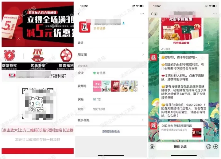 全国拥有上万家店的肯德基在私域运营上是相当成功的,无论是在线上各大平台还是线下门店,我们都很容易看到肯德基做社群引流的动作。比如肯德基的大厅里和收银台处都会放置引流海报,通过进群领超实惠福利的诱惑,吸引客户扫码添加门店企微好友,再自动推送加群邀请。