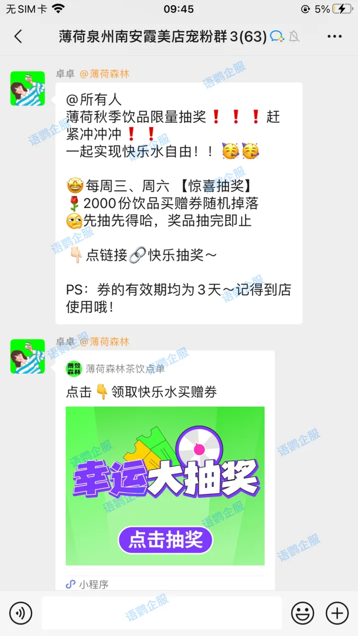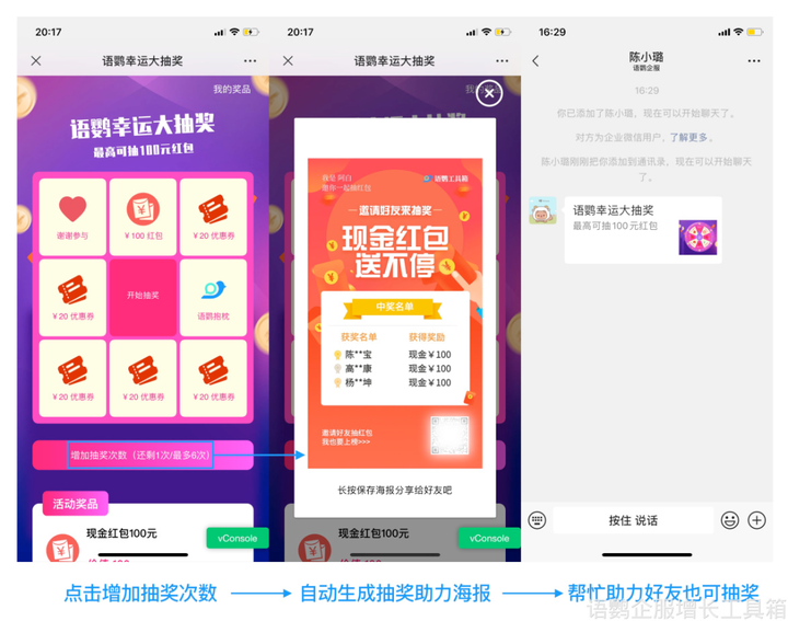 商家可结合语鹦企服的「大转盘/九宫格抽奖」与「仅好友参与」轻松实现裂变。商家可设置加好友或进社群才能参加抽大奖活动,那么就可保证每个参加抽大奖活动的客户都成为好友或进社群,以此裂变的目的。