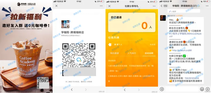 小众咖啡馆“学咖院”设计了拉新福利海报,加上进群二维码,以邀请进群送0元咖啡券为诱饵,吸引客户扫码进群后,推送入群欢迎语,指引点击成功邀请好友进群的链接,查看邀请任务,并可见邀请人数。如达成邀请任务,客户即可获得0元咖啡优惠券,如尚未完成,则会显示你已邀请0人,提醒客户尽快完成来获得奖励。