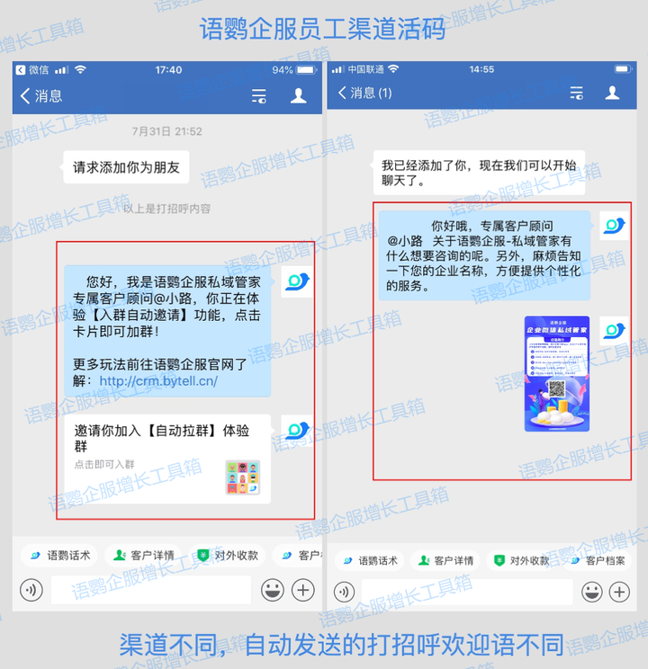 目前市面上有一些比较成熟的提供云服务私有部署的第三方,比如语鹦企服就是一个很不错的SCRM系统,它提供了许多实用的功能,包括自定义欢迎语、客户画像、社群运营、快捷回复等。通过语鹦企服,企业可以在不同的渠道客户中显示不同的欢迎语,让客户更清晰地了解加入的信息。