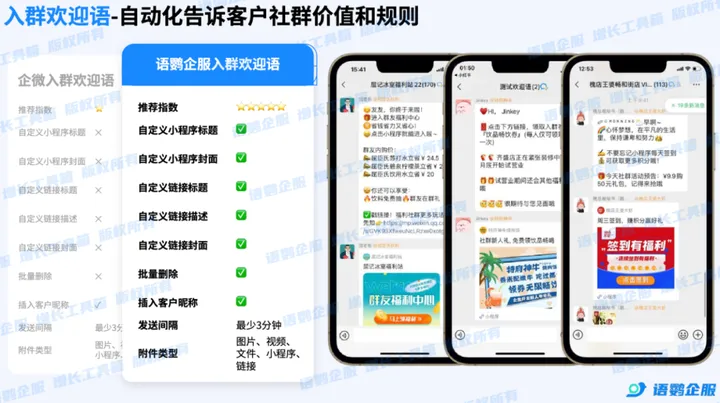 添加客户为好友和邀客户入群一步到位,高效引流的同时,还可以实现入群自动发送欢迎语,让客户倍感温暖的同时节省社群运营人员的工作量~
