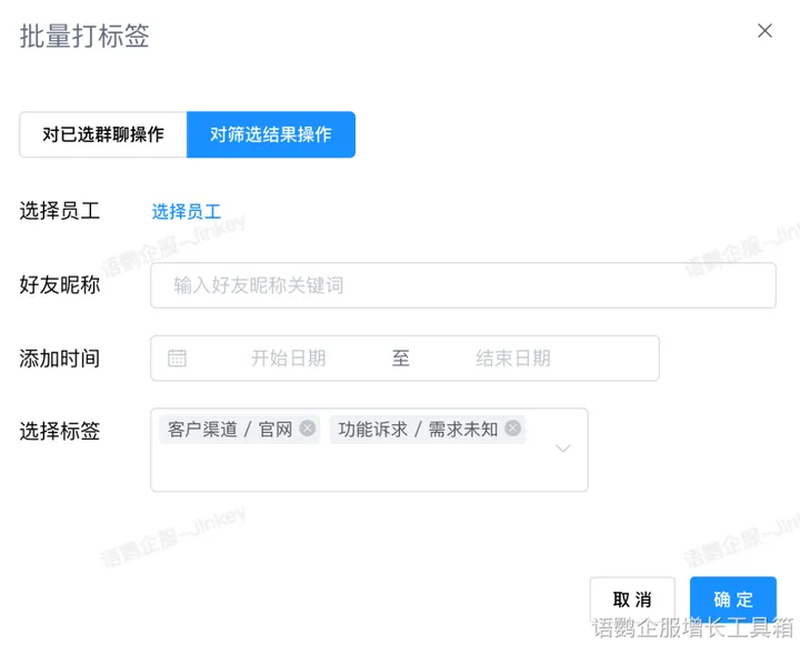 有活动需要通知客户的时候,一个一个打招呼就比较麻烦了,这时候可以结合语鹦企服「好友列表」的批量打标签来使用,给新用户批量打上标签后,再使用群发功能给用户群发产品介绍、商城链接等等,以达到快速激活转化用户的目的。可供筛选的条件目前支持员工、昵称包含关键词、添加好友时间,然后设置要覆盖的标签。