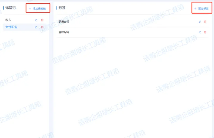 在语鹦企服后台找到「客户管理」—「社群标签」,创建一个标签组,并设置好标签,比如做职场教育的企业私域里有些社群是以22-25的职场新人为主,有些社群是以35岁职场中层管理为主,那可以分别给社群打上「职场新人」或「中层管理」的标签。