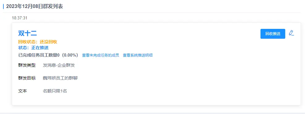 任务发布之后会在任务的右上角出现回收群发的选项,点击[回收推送]即可立即回收该群发,回收后员工将不能发送消息,实现群发撤回,有任何问题企业能在第一时间将影响压到最小。
