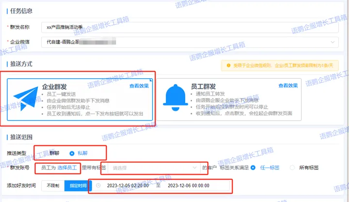 语鹦企服的[定时群发功能]提供了一个高效便捷的客户管理方式。通过这项功能,企业可以轻松地挑选出目标客户群体,并根据客户的标签分类进行精确的消息群发,这样的定向群发大大提高了营销信息的到达率和影响力。
