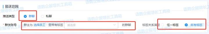 并且语鹦企服还支持群聊分标签,目前企微官方是无法分群聊群发的,都是默认所有群一起的,但利用语鹦企服增长工具箱,可以做到分标签对应群聊群发。