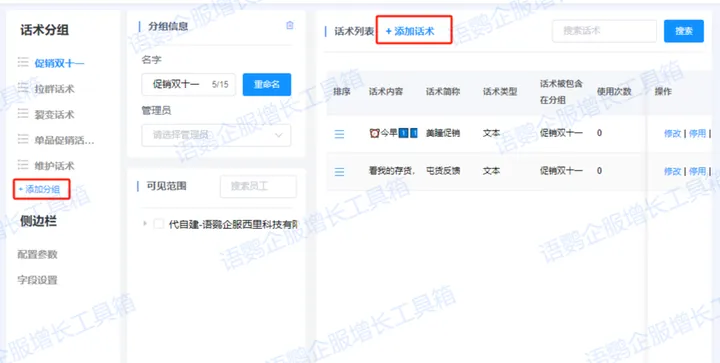 另外可以在语鹦企服的质量管理 — [话术库]功能提前设置好话术,通过人工多群多人转发的方式发送。
