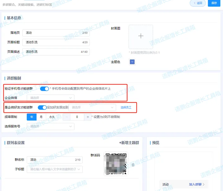 但当新客户数量庞大时,群管理员24小时在线并立即同意客户入群申请也不现实。语鹦企服的【关键词进群】功能里设置验证手机号后再入群则能解决这个问题,通过落地页扫码添加群聊时需要通过手机号关键词验证,手机号会自动配置到用户的企业微信名片上。还可以选择必须是企微好友才能入群,双重筛选同时也让没有添加管理员好友的客户重新添加。