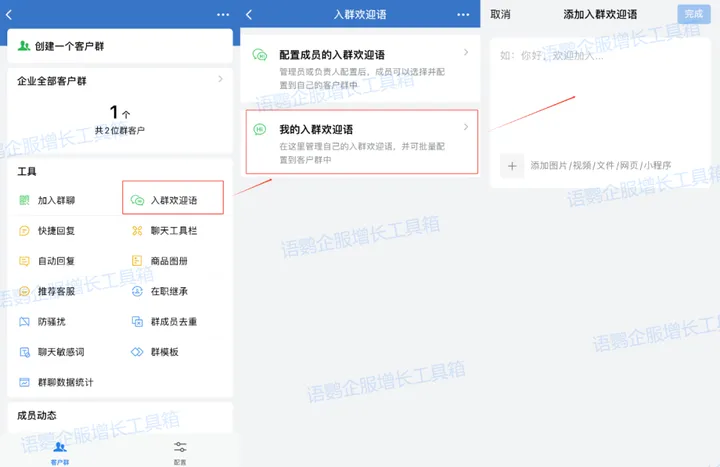 在企业微信后台【客户群】—【配置】—【欢迎语】设置好欢迎语后才能在新客户入群的第一时间发送欢迎语,或者也可以在语鹦企服的【入群欢迎语】功能里设置,和企微自带的相比,语鹦企服支持自定义修改小程序封面、标题和链接,还能@新客户ID,让社群内容更有吸引力。入群欢迎语里加入抓人眼球的小程序页面并艾特客户ID,不仅能引起客户注意,还能为客户提供受重视的情绪价值,客户对品牌好感直线上升。