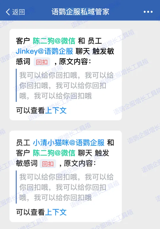 语鹦企服的[会话存档]还提供了敏感词、敏感行为监控功能,我们在后台提前设置好敏感词和敏感行为,只要员工在聊天过程中触发这些关键词,就会给管理员自动发送提醒,并生成报表,追溯跟踪,有效控制企业微信消息风险。