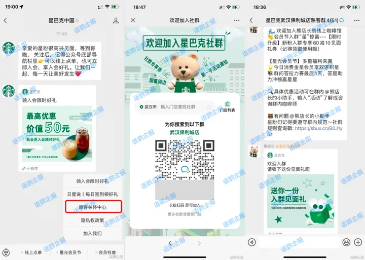 星巴克社群的入群链接是设置在公众号内,当客户搜索打开星巴克官方公众号、小程序时,系统会自动定位距离客户最近的门店,并发送该社群二维码。客户扫码加入社群后,会自动发送欢迎语和福利点。