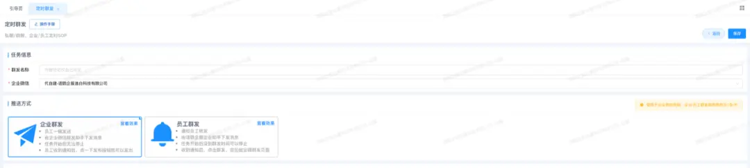 为避免忘记,推送时间中还可设置“提醒时间”;推送内容也是非常多样化,有图片、视频、文件、链接和小程序格式,管理者可根据需求自行选择合适的群发内容样式。填写完毕后右上角选择“保存”,即创建好定时任务,此外,还可查看员工的定时群发任务明细,更直观。