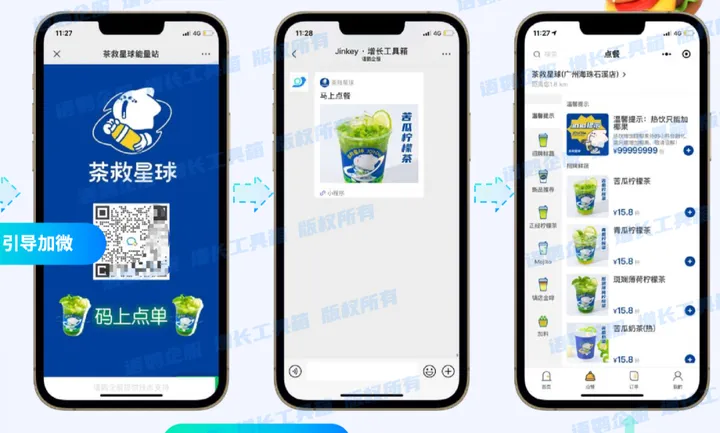 茶救星球就通过语鹦企服的增长工具箱「仅好友参与」功能,将优惠券和点餐流程搭配添加私域好友的门槛将用户在企微社群里进行二级留存实现门店客户私域复合留存率高达95%,单月吸粉4W+。