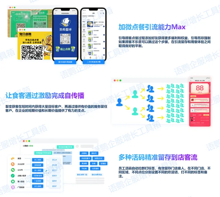 针对餐饮连锁品牌门店多难统一管理、门店客流复杂难触达、营销活动单一客户难心动等多个痛点,语鹦企服提供多种解决方式和功能组合:点餐系统配合「仅好友参与」功能为门店留住第一波种子客户,「好友裂变」和「员工活码」一套裂变引流组合拳协助企业实现私域持续增长。