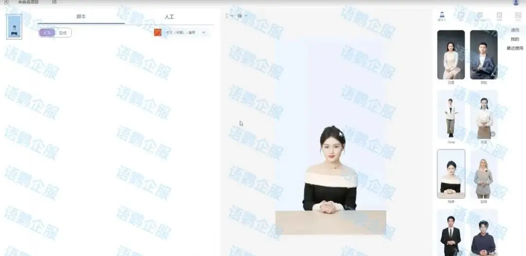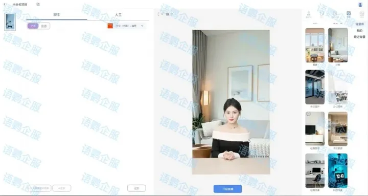 语鹦企服「数字人直播」使用简单,可以轻松配置直播间数字人及场景。平台提供丰富的数字人形象,企业可根据需求选择并直接应用。